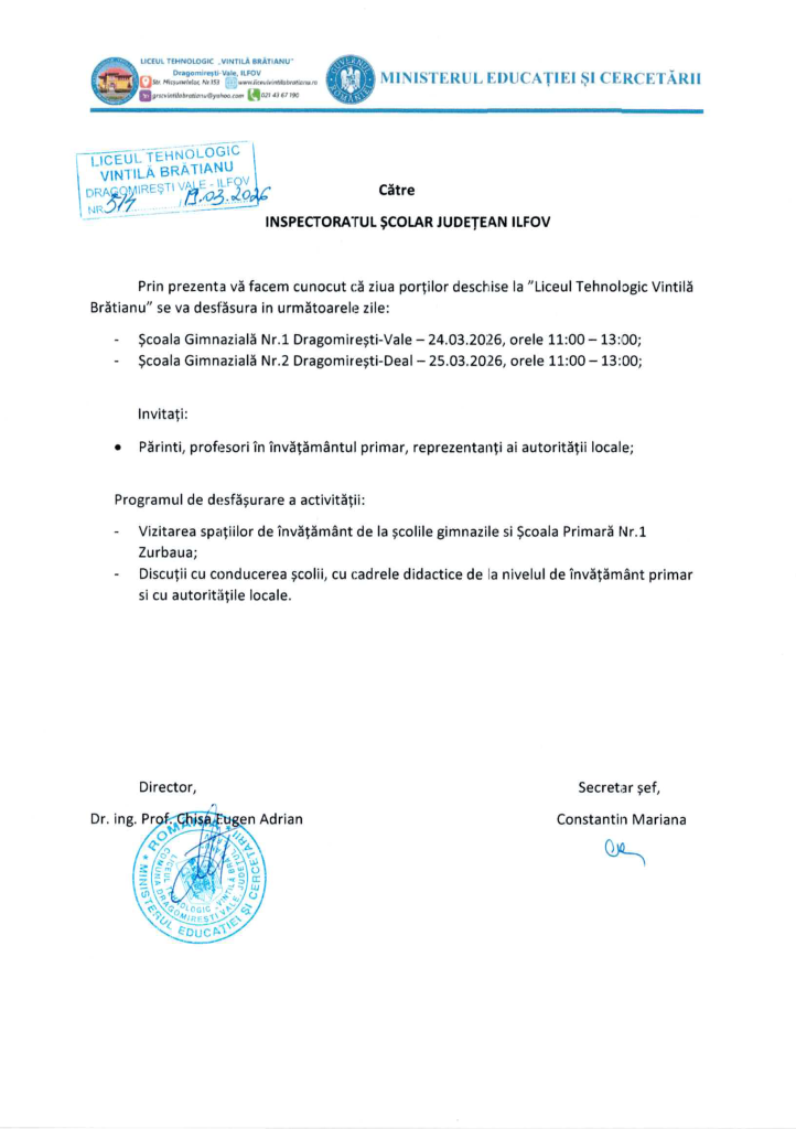 Liceul Tehnologic „Vintilă Brătianu” din Dragomirești-Vale anunță cu satisfacție alegerea elevei Mustăciosu Diana, din clasa a XI-a B, profil filologie, în funcție de președinte al Consiliului Elevilor la nivel județean. Recunoaștere a implicarii sale constante în activitatea școlară și în proiectele dedicate reprezentării elevilor. De-a lungul activității sale educaționale, eleva sa evidențiat prin responsabilitate, capacitate …